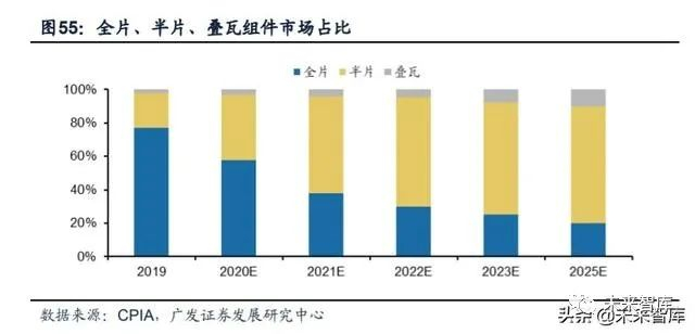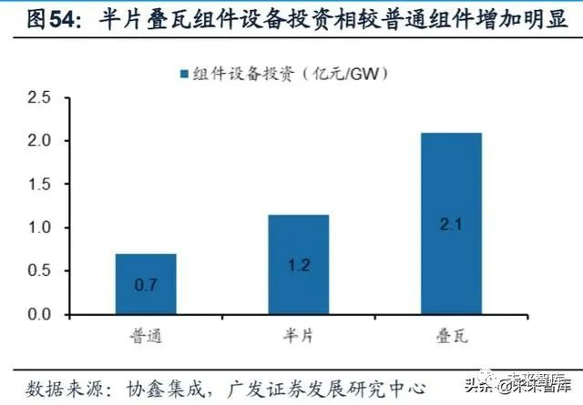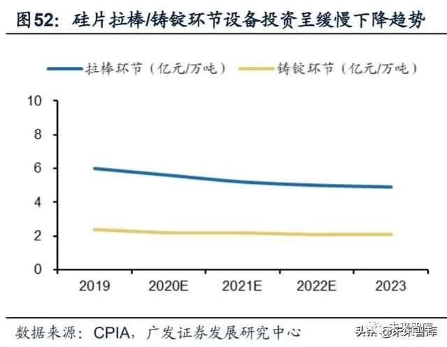 降本增效持续推进,电池、组件环节技术升级带动固定资产投资增加。经过多 年发展与演进,硅料、硅片的生产技术已趋于稳定,设备及产线投资强度呈缓慢下 降趋势。电池、组件环节技术变革潜力大,未来固定资产投资占比或将提升。2019 年PERC电池技术市占率已经超过65%,预计2020年占比将继续提升,PERC市场渗 透率的大幅提升使得这种新技术的超额受益逐渐减少,行业积极探索Topcon、HJT 及IBC技术等以获得领先市场的超额受益。HJT、Topcon等N型电池初始设备投资相 比现在的PERC产线更高,例如目前单位GW的PERC产线设备投资约1.7亿元,HJT 约5-6亿元,全新Topcon产线约2亿元,老产线升级改造成Topcon需要新增设备投资 额约3000-4000万。因此,新型电池技术的推广和应用将提升电池环节的设备投资占 比。组件环节,普通组件设备投资约0.7亿元/GW,半片封装工艺成本在此基础上增 加4000-5000万,叠瓦组件设备投资约2亿元/GW,根据CPIA预测,叠瓦和半片市场 渗透率不断提升,2021年将超越全片技术成为主流组件封装工艺,由此,带动组件 环节的投资增加。