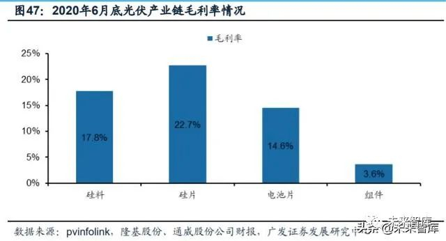 2)组件企业加速向上游延伸以应对终端环节的降价压力。2020年6月底,硅片 和电池片环节先进产能的毛利率分别为22.7%和14.6%,相对组件环节具有 更高的盈利水平,组件企业通过向上游领域延伸,将电池及硅片环节的盈利 留存在体内,从而对终端产品降价具有更高的容忍度。