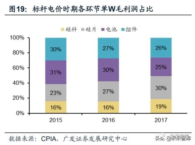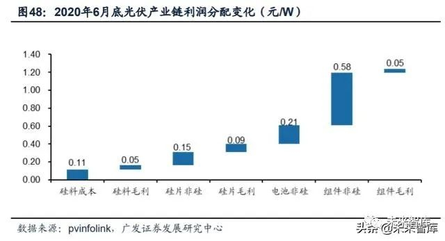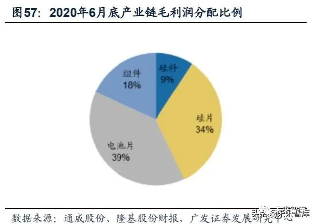 3)平价上网过程中,硅片环节将分摊更大的降价压力。2020年6月底,光伏硅 料、硅片、电池片、组件的毛利润占比分别为9%、34%、39%、18%;2015- 2019年光伏各环节固定资产投资占比基本稳定,以2019年的占比28%、20%、 36%、16%计算,各环节超额盈利占比分别为-19%、14%、3%、2%。假设 平价上网后仍各环节固定资产投资比例保持不变,则各环节的毛利润分配也 将向这一比例趋同。硅片环节20%的投资对应目前34%的毛利分配,硅料环 节则以28%的固定资产投资对应目前9%的毛利分配,因此在行业走向平价 过程中,硅片环节将承担更大的降价压力,硅料环节降价压力则最小,利润 分配占比有望迎来修复。