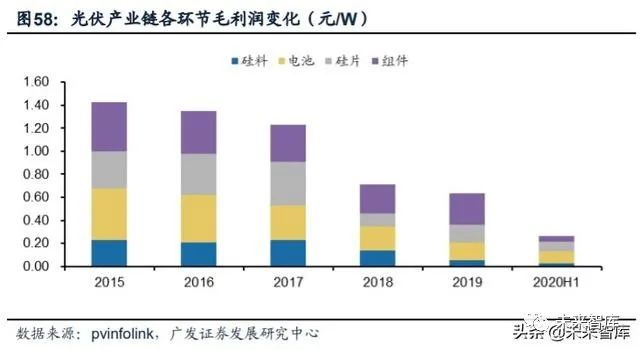 1)组件行业加速淘汰落后产能,市场份额向龙头集中。经过我们测算,2020 年6月底独立的光伏组件环节毛利率已经低于5%,组件环节毛利占比已由 2019年的42%下降至目前的18%,是2015年以来的最低水平,但若要满足 全国55%的新增装机实现平价上网,组件价格仍需下降20%至1.24元/W;因 此我们认为这将导致组件环节独立第三方企业及落后产能因亏损而退出市 场,组件环节市场份额加速向龙头集中。