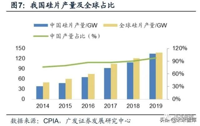 我国光伏产业快速发展,2017年各环节产业规模占全球比重均超过50%,确立 全球竞争优势。根据BP数据,全球光伏新增装机从2014年的37.96GW增至2017年 94.01GW,年均增速35%,中国光伏新增装机从2014年的10.64GW提升至2017年的 53.01GW,年均复合增速70.8%,新增装机全球占比从2014年的28%提升至2017年 的56.4%。光伏应用市场快速发展带动下,我国光伏产业链各环节生产规模持续增长。2017年我国多晶硅产能27.7万吨,产量24.2万吨,全球占比54.8%,连续七年位居全 球首位;硅片产能105GW,产量92GW,全球占比87%;电池片产能82.8GW,产量 72GW,全球占比69%;组件产能105.4GW,产量75GW,全球占比71%。由此,2017 年我国光伏各环节产业规模占全球比重均超过50%,确立了全球竞争优势。