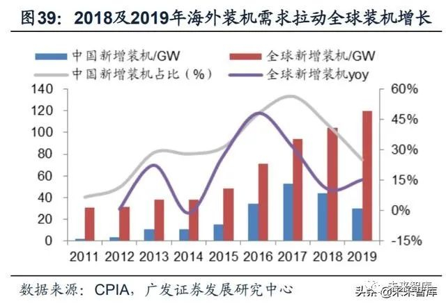 产业链降价引爆海外需求,全球新增装机稳步增长。2018“531”政策出台后, 光伏标杆电价下调及行业需求减少导致产业链价格大幅下降,截至2018年三季度末, 硅料、单晶硅片、多晶硅片、单晶电池片、多晶电池片、单晶组件、多晶组件价格相 比年初分别下降40%、43%、58%、42%、53%、30%、33%,产业链价格大幅下滑 带动装机系统成本降低,收益率提升刺激海外装机需求快速增长;2018年-2019年海 外装机量分别为60GW和90GW,同比分别增长46%和50%。在海外光伏新增装机快 速增长带动下,2018年全球实现光伏新增装机104.1GW,同比+2.1%。2019年光伏 产业链降价驱动海外新增装机达到90GW左右,助力全球光伏新增装机实现120GW 水平,同比+15.3%。