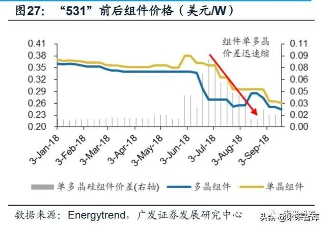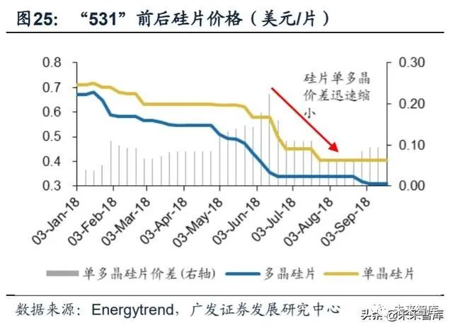 单晶多产品价差大幅压缩,单晶产品经济性凸显。2018年“531”政策的影响叠 加需求的下滑使得光伏产业链价格出现了明显的下降。“531”政策出台之后两个月, 硅料和电池片的价格下降幅度分别是25%和30%,电池片和组件下均超过了35%。单晶产品的单W盈利水平更高,相比多晶产品具有更大的价格下降空间,“531”政 策出台后,单晶硅片降价幅度更大,单多晶硅片之间的价差从0.225美元/片,最低拉 低到0.065美元/片,单多晶硅片的价差明显降低;单多晶电池片价差从0.056元/W, 最低拉低至0.004美元/W,单晶电池几乎与多晶电池同价;单多晶组件价差从0.086 美元/W,最低拉低至0.008美元/W,单多晶组件几乎同价。在硅片、电池、组件各环 节单多晶产品价差大幅压缩情况下,单晶产品的经济性越加凸显。