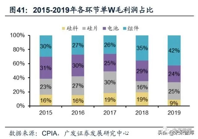 海外市场提升终端话语权,组件毛利占比大幅提升。海外市场需求快速增长带 动中国组件出口规模增加,2019年晶科、晶澳、天合、隆基、阿特斯及东方日升的 海外组件出货占比分别达到82%、70%、74%、63%、92%、80%;同时海外订单一 般提前1至2个季度锁定价格,且对在海外知名度较高的组件品牌给予一定溢价,因 此具有更高的盈利水平。2019年我国光伏组件出口达到63.5GW,同比+62%,受益 于此组件环节利润分配占比大幅提升,2019年组件以16%的固定资产投入获得了产 业链42%的毛利润,相比2017年提升16个百分点,达到2015年以来的最高水平。