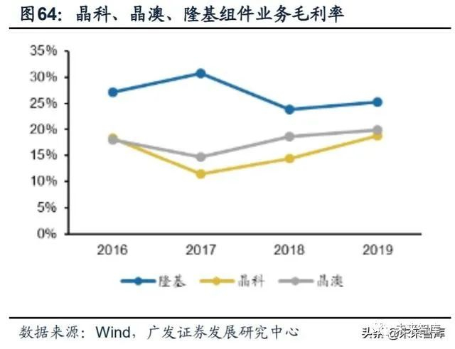 (3) 隆基股份:以硅片产能为主,2015年收购乐叶朝组件发展,目的在于推广单晶 产品以及品牌推广,打通销售渠道以消化庞大的硅片产能。硅片环节的规模效 应也使得其毛利率维持在25%附近,高出其他厂商5个百分点。2019年底公司拥 有组件、电池片、硅片产能分别为16、15和45GW,规划2020年达到30、25和 75GW。