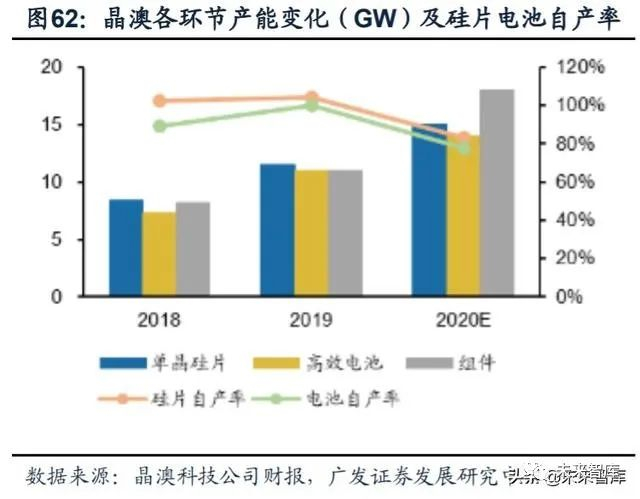 (1) 晶科能源:产能以组件优先,电池自产率在40-60%左右,硅片自产率超过80%。截至2019年,晶科拥有组件产能16GW,电池产能10.6GW,硅片产能13.2GW, 根据公司规划,预计2020年底组件和硅片产能将分别提升至25GW和22GW,电 池产能则变化不大。