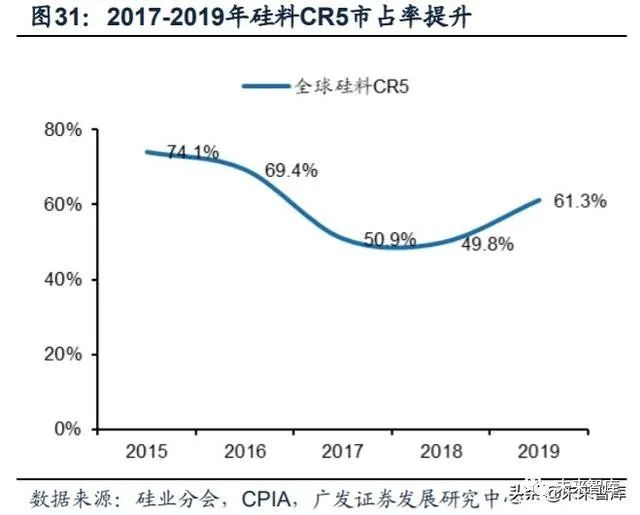 硅料环节,国内龙头企业乘势而上,扩产带动市占率提升。保利协鑫、永祥股 份、新特、大全新能源、东方希望等企业2019年硅料产能分别达到11.8、8、7.2、7 和4万吨,分别在2017年基础上增加4.4、6.0、3.6、5.0、2.5万吨,在全球硅料环节 的市占率分别达到18.1%、12.3%、11.0%、10.7%、6.1%,相比2017年市占率分别 提升4.5、8.6、4.4、7.1、3.4个百分点。保利协鑫跃居全球市占率第一的硅料企业, 四川永祥、新特、大全新能源分别取代德国瓦克、韩国OCI、美国Hemlock成为全球 排名2-4位的硅料企业。2019年全球前5家硅料企业市占率61.3%,相比2017年提升 10.3个百分点。