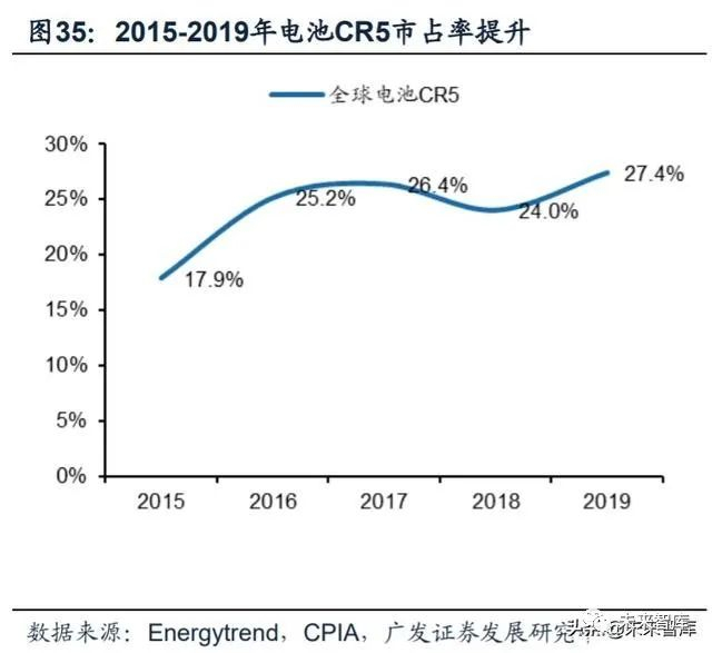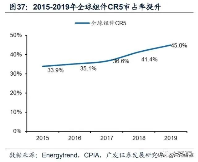 电池片环节,市场仍较分散,独立第三方电池企业崛起。2017年全球市占率前 4位的电池企业为天合、晶澳、韩华和阿特斯,电池产能主要为自己组件产能做配套, 独立第三方通威股份全球电池产能市场份额不到5%。随着下游组件需求增长及产能 扩张,组件企业外购电池需求大幅增加,通威股份、爱旭股份凭借成本优势、技术优 势获得长足发展,产能规模持续增加,2019年通威股份电池出货13.4GW,全球市占率达到10.1%,成为全球最大的光伏电池生产商。爱旭股份电池出货量达到6.79GW, 以5.1%的全球市占率排名第二。2019年电池环节的市场集中度有所提升,前5家企 业市占率27.4%,相比2017年提升1个百分点,但与上游硅片、硅料环节相比,电池 环节市场竞争格局仍较为分散。