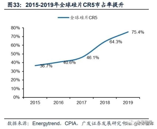硅片环节,单晶确立绝对优势,隆基&中环市占提升明显。随着单晶在下游应用 领域渗透率不断提升,并在2019年实现对多晶份额的超越,上游硅片环节市场竞争 格局也发生显著变化。致力于推广单晶硅片应用的隆基股份、中环股份2019年市场 占有率分别达到24.3%和17.8%,相比2017年市场份额分别提升12.5和11.3个百分 点,成为全球硅片领域市占率第一和第三的企业。保利协鑫以铸锭单晶硅片获得18.9% 的全球市占率,为全球第二大硅片供应商。2019年全球前5家硅片企业市占率75.4%, 相比2017年提升29.3个百分点,行业集中度上升明显。