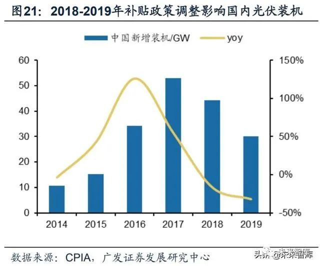 2019年开启光伏竞争性配置新阶段。2019年5月30日,国家能源局制定了以竞 价上网方式确定光伏项目补贴强度以及装机规模的总体工作思路,规定了30亿的光伏补贴总规模,其中户用项目补贴7.5亿元,普通光伏电站、工商业分布式以及国家 组织实施的专项工程和示范项目,补贴总额不超过22.5亿元。发改委将集中式光伏 电站标杆上网电价改为指导价,新增集中式光伏电站上网电价通过市场竞争方式确 定,但不得超过所在资源区指导价。2019年I~III类资源区光伏发电项目指导价分别 确定为每千瓦时0.40元(含税,下同)、0.45元、0.55元,户用分布式光伏全发电量 补贴标准调整为每千瓦时0.18元。由于项目建设时间、竞价申报经验不足等因素, 2019年国内光伏新增装机30.1GW,同比下降32%。
