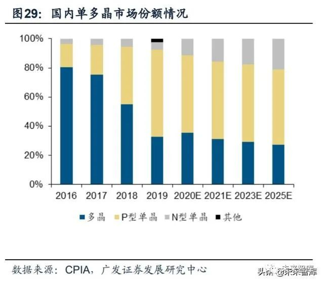 PERC电池技术助力单晶逆袭,重塑各环节竞争格局。PERC电池相对传统BSF 电池具有更高的转化效率,与单晶硅片相结合形成的高效单晶PERC电池及组件可 实现对光伏单W装机成本的进一步摊薄。2017年PERC电池技术市场渗透率只有 15%,2018年提升至33.5%,2019年进一步提升至65%。PERC电池技术成熟及普 及应用,加速了单晶产品市场渗透率的提升,单晶占比从2017年的24.5%提升至 2018年的45%,2019年单晶市场占有率达到65%,彻底超越多晶占据绝对统治地位;单晶高效产品市占率提升,行业降本增效加速推进,重塑子环节竞争格局。