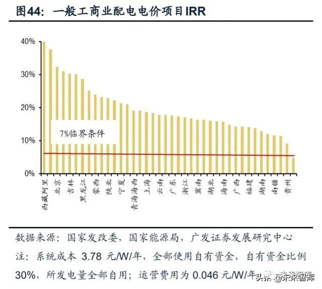 按照用户侧电价水平,全国近80%区域的分布式光伏电站IRR大于7%。假设光 伏系统成本3.78元/W/年,系统效率83%,首年光衰2%,后线性衰减0.65%,运营费 用为0.046元/W/年,项目自有资金比例30%,结合对全国不同地区光照资源的统计 数据,计算得到40个光伏区域的项目内部收益率水平。