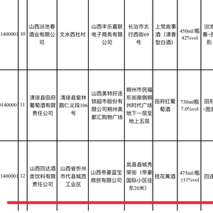新京报讯 (见习记者 赵方园)8月10日,新京报记者从山西省市场监督管理局官网上了解到,其最新发布的2020年第22期食品安全监督抽检信息通告显示,山西省市场监督管理局近期对23类食品661批次进行抽检,抽样检验项目合格样品649批次,不合格样品12批次,其中涉及3款酒类产品,分别是山西汾池春酒业有限公司的上党故事酒(清香型白酒),清徐县田府葡萄酒有限造任公司生产的田府红葡萄酒,山西四达酒类饮料有限责任公司生产的桂花黄酒。