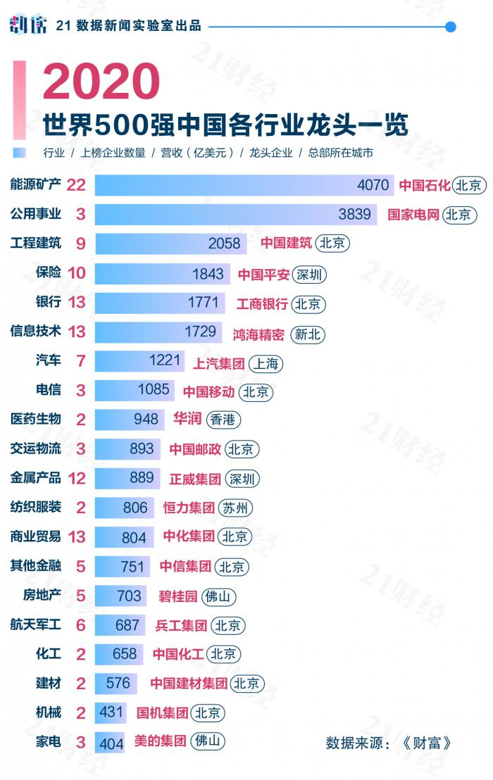 据21数据新闻实验室统计,来自能源矿产的企业最多,共22家,其次是信息技术、商业贸易,均有13家企业上榜。