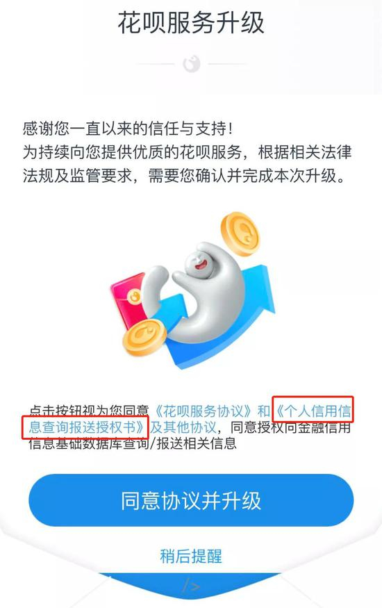 如果你同意升级,意味着视为你同意《花呗服务协议》和《个人信用信息查询报送授权书》。