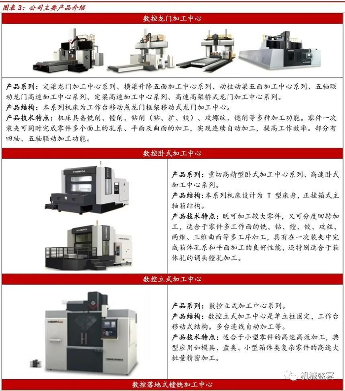公司中大型数控龙门加工中心行业领先,继续研发保持竞争优势。公司自成立以来,其产品定位一直是高端数控机床,此类产品技术含量高、附加值高,客户主要集中在航空航天、高铁、汽车零部件、模具等对机床加工要求较高的领域。公司已在中大型数控龙门加工中心领域取得领先优势,未来公司仍将不断完善产品结构、丰富产品系列,满足高端数控机床市场,提升公司产品的性能和竞争力。
