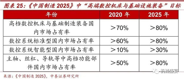 核心零部件国产化符合国家产业政策的方向。《中国制造2025》规划中“高端数控机床与基础设施装备”之具体目标如下:到2020年,高档数控机床与基础制造装备国内市场占有率超过70%;数控系统标准型、智能型国内市场占有率分别达到60%、10%,主轴、丝杠、导轨等中高档功能部件国内市场占有率达到50%;到2025年,高档数控机床与基础制造装备国内市场占有率超过80%;数控系统标准型、智能型国内市场占有率分别达到80%、30%;主轴、丝杠、导轨等中高档功能部件国内市场占有率达到80%,高档数控机床与基础制造装备总体进入世界强国行列。可以看出,“中国制造2025”期间,机床工具行业的主要目标之一即是推进数控系统和功能部件的产业化进程,但截至目前,我国95%以上的高端数控系统市场和80%的中端市场依旧被国外品牌占据,与之相配套的主轴、伺服电机等亦主要依赖进口。因此,推进机床行业核心零部件国产化符合国家的产业政策的方向,也是国内机床行业亟需补齐的一块短板。