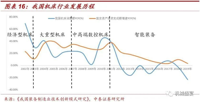 4)2011年-至今,国内机床行业加速整合,机床产业正在改变过去简单追求规模、数量和增长速度的发展模式,朝向高质量发展模式转变。一直以来,国内机床行业都把在做大规模作为导向,处于“低端混战、高端失守”的被动局面,长期被发达国家打压在产业链中低端,全行业长期被低利润困扰,亏损面不断扩大。随着中国通用技术集团重组沈阳机床和大连机床,国内机床行业加速整合的大幕已然拉开。我国机床产业凭借全球最大的市场、研发、制造和供应体系,已形成了从材料、功能部件、整机、现代服务体系到诸多领域应用覆盖的完整产业生态链系统。近几年,我国机床行业不仅在制造规模上处于世界领先的位置,并且不断将产品的生产与现代化技术相结合,逐步走向智能化,技术水平得到显著提升,正逐渐缩短与日德等国差距。
