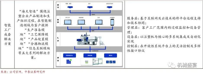 3)智能工厂成套解决方案:包括“海天智造”围绕注塑企业产品制造和生产组织过程,在智能制造领域为客户提供“生产准备模块”“工艺保障模块”“产品处置模块”“分拣物流模块”“信息互联模块等五大系列的解决方案。
