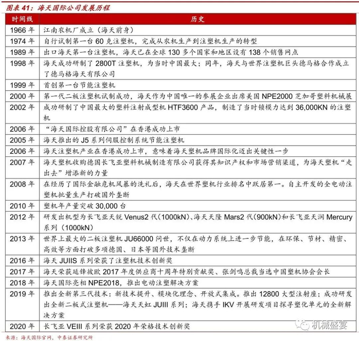 小结:两家企业的创始人及在任董事长均为张静章先生,参照海天国际成长路径,海天精工具备成长壮大优秀“基因”。两家企业同为海天集团旗下上市公司,海天国际已成长为全球注塑机龙头,代表中国注塑机的最高水平。海天国际以技术强企,旗下有“长飞亚”、“海天”、“天剑”三大品牌面向高中低市场,可覆盖塑料加工行业的各个领域。海天国际的发展历程为海天精工提供了可借鉴的成功经验,海天精工具备成长壮大的优秀“基因”。
