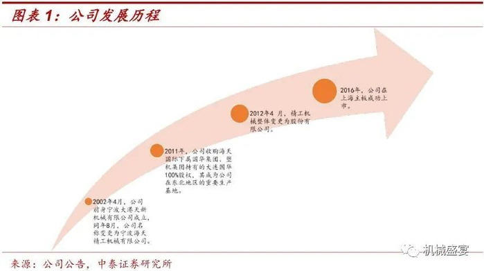 公司深耕数控机床十八载,始终伫立在国内数控机床市场与技术的潮头。2002年4月,公司前身宁波大港天新机械有限公司成立,同年8月,公司名称变更为宁波海天精工机械有限公司;2011年,公司收购海天国际下属国华集团、塑机集团持有的大连国华100%股权,其成为公司在东北地区的重要生产基地;2012年4 月,精工机械整体变更为股份有限公司;2016年,公司在上海主板成功上市。公司自成立以来致力于高端数控机床的研发、生产和销售,拥有宁波大港、宁波堰山、大连海天精工三大制造基地,已经成为国内领先的数控机床研发、生产企业,多年来始终站在国内数控机床市场与技术的前沿,是国家重大技术装备企业,国家高新技术企业,省级高新技术研发中心。