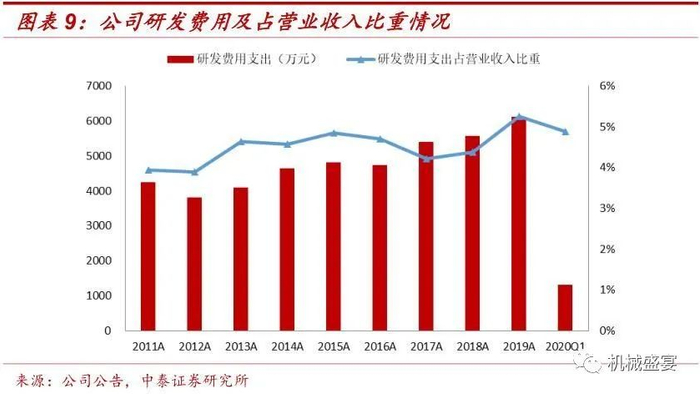 在行业低迷的背景下,公司研发投入不断增加,有助于持续提高竞争优势。2019年,公司研发支出为0.61亿元,比上年同期增加9.88%。研发投入的持续增加保障了公司不断拓展和丰富产品的规格和品种,提升产品的市场竞争力。2019年,公司新增模块品种10余种,完成两大系列7个新品种的开发(主要针对小型批量化产品的开发),未来将批量投放市场,提升公司的规模效益。此外,在长期市场低迷,经营困难的情况下,企业普遍难以投入足够的资金创新研发,产品结构得不到更新,转型升级效果不理想。在当前情况下,以生存为第一要务的相当多的国内企业无暇顾及投入资金进行高端产品研发,需求的升级和企业产品结构的矛盾日益突出。公司自上市以来,资产负债率不断降低,银行授信额度充足,可以投入足够的资金进行市场开拓和新产品研发。资金优势将有助于公司在行业低迷时进一步巩固领先地位。