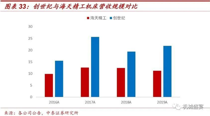 产品定位方面,创世纪高端智能装备业务立足于中高端数控机床产业,下游主要面向3C消费电子行业,同时再向汽车制造、航空航天、轨道交通等领域延伸,产品涵盖金属切削机床、非金属切削机床、激光切割机床等三个主攻方向,是国内同类型企业中技术宽度最广、产品宽度最全的企业之一。而海天精工立足于高端数控机床,服务的客户主要是航空航天、高铁、汽车零部件、模具等领域,同时开发小型批量化产品,面向3C、5G通讯等。可以看出,创世纪正在从应用于3C领域的机床向应用于汽车制造、航空航天等领域的大型机床延伸,海天精工则相反,两者产品的区间重叠度正在加大。