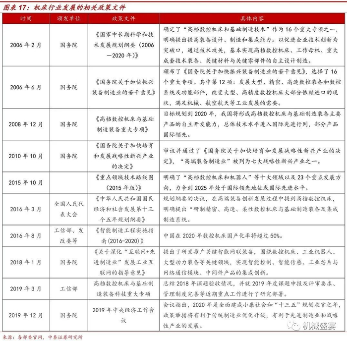 2)以中国通用技术集团为代表的国企:沈阳机床和大连机床被央企中国通用收购,体现出国家对机床行业的支持力度不减,随着全行业兼并重组进程的展开,国内机床行业竞争格局将得到逐步优化,机床市场有望持续出清,民营机床将迎来发展良机;