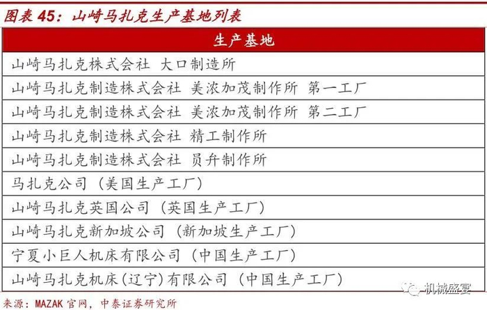 全球机床龙头,工厂遍布全球。1919年,山崎马扎克(MAZAK)由山崎贞七(Sadakichi Yamazaki)在名古屋创立,20世纪20年代,公司产品逐渐从制造垫子的机器发展到木工机械,再到金属加工机床。二战为公司发展提供了契机,大量军需产品急需机床生产供应,从而助推了公司机床业务的快速发展,二战后,机床需求减少,公司发展受挫。20世纪50-60年代,MAZAK在第二代领导人的带领下走向复苏,并在20世纪60年代确立了公司对美国市场的出口地位。20世纪70至80年代,公司在美国的在岸业务进一步发展(包括机床制造业务),成为美国及全球机床市场上最重要的参与者之一。20世纪80年代,公司在英国成立欧洲制造工厂,并建立了全球销售和客户支持网络。截至目前,MAZAK在全球设有10个工厂(具体分布见图表22),公司已成长为机床行业的全球领军企业。