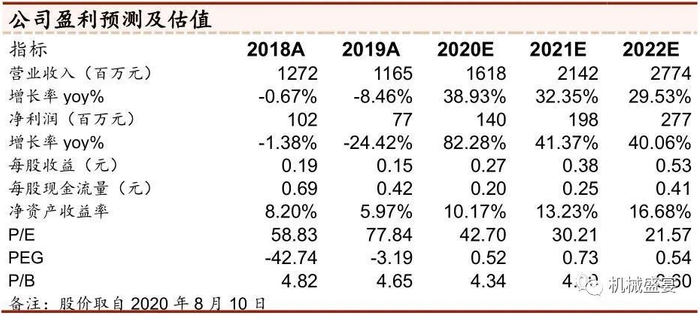 公司是国内高端数控机床引领者,工匠精神+市场化战略,在国内机床行业稀缺性凸显,受益行业景气度复苏,叠加下游需求上升,公司有望迎来业绩快速成长的拐点,同时对标工业机器人,估值存在较大修复空间。预计2020-2022年公司净利润分别为1.40亿元、1.98亿元、2.77亿元,对应PE分别为43、30、22倍。首次覆盖,给予“买入”评级。