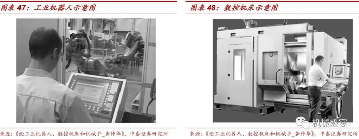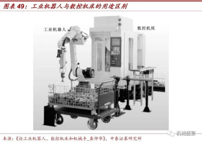 用途方面,研发数控机床的根本目的是解决机床在轮廓加工时的刀具运动轨迹控制问题;而研发工业机器人的根本目的是用来协助或代替人类完成那些单调、重复、 频繁或长时间、繁重的工作,或进行高温、粉尘、有毒、易燃、易爆工作环境下的作业。换言之,数控机床是直接生产设备,而大部分工业机器人是用来替代或部分替代操作者的生产辅助设备。图表32是数控机床与上/下料工业机器人组成的柔性加工单元,可以较好地反映了两者的用途区别。