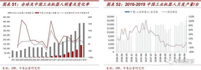 无论是工业机器人,亦或是机床,高端市场均被国外垄断,国产品牌正在突围。其中,工业机器人领域,国内机器人本体市场空间广阔,但高端市场被机器人“四大家族”垄断,2018年中国工业机器人本体市场中,发那科(日本)市占率16.4%,ABB(瑞士)市占率14.3%,库卡(德国)市占率9.9%,安川(日本)9.4%,国产本体主要集中在中低端市场,市占率23.7%。自2013年我国超过日本成为全球最大工业机器人市场以来,已连续六年保持第一地位,2019年国内工业机器人产量18.7万台,同比增长26.5%。