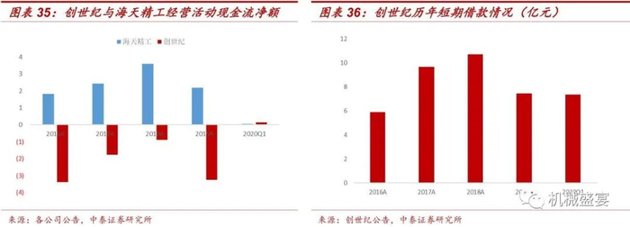 2) 现金流方面,2016年以来,创世纪几乎每年年底经营活动产生的现金流量净额为负值,且短期借款金额较高,偿债压力较大。而海天精工几乎每年年底经营活动产生的现金流量净额为正值,且自2018年以来无短期借款,偿债压力小。