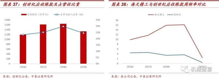 3)应收账款方面,创世纪应收账款占营业收入比重较大,2019年达24.47%,比例高于海天精工,且应收账款周转率低于海天精工。