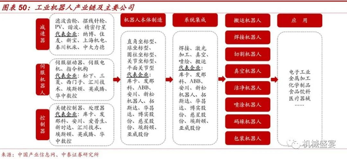 产业链方面,工业机器人产业链包括上游核心零部件、中游机器人本体制造、系统集成和下游应用四个环节。其中核心零部件主要包括减速器、伺服电机与控制器,在机器人总成本中占比约六成,是制约我国工业机器人发展的主要技术瓶颈;机器人本体制造和系统集成的技术门槛相对较低,国内企业大多专注于工业机器人本体制造或系统集成;下游应用涉及汽车、电子、金属等行业。可以看出,工业机器人和机床两者产业链相似,上游均为控制系统等核心零部件,国内企业偏向下游集成。