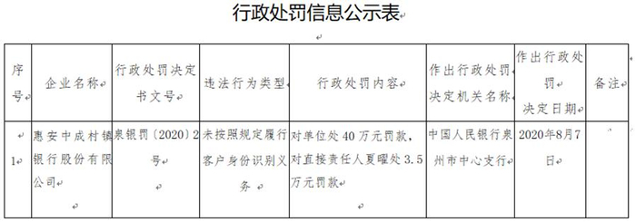 中国经济网北京8月11日讯 中国人民银行福州中心支行昨日公布的泉州市中支行政处罚信息公示表(泉银罚〔2020〕2号)显示,惠安中成村镇银行股份有限公司(简称“惠安中成村镇银行”)存在未按照规定履行客户身份识别义务的违法行为。2020年8月7日,中国人民银行泉州市中心支行对该行处40万元罚款,对直接责任人夏曜处3.5万元罚款。
