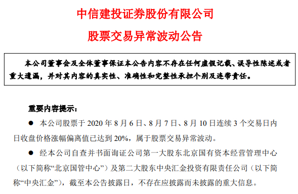 这已是近一周来中信建投证券的第二次澄清事项。上周四,即8月6日下午,市场上关于中信建投与中信证券合并的传言再起,当天,中信建投A股股价收涨9.24%。当晚,中信建投证券就发布了澄清公告。
