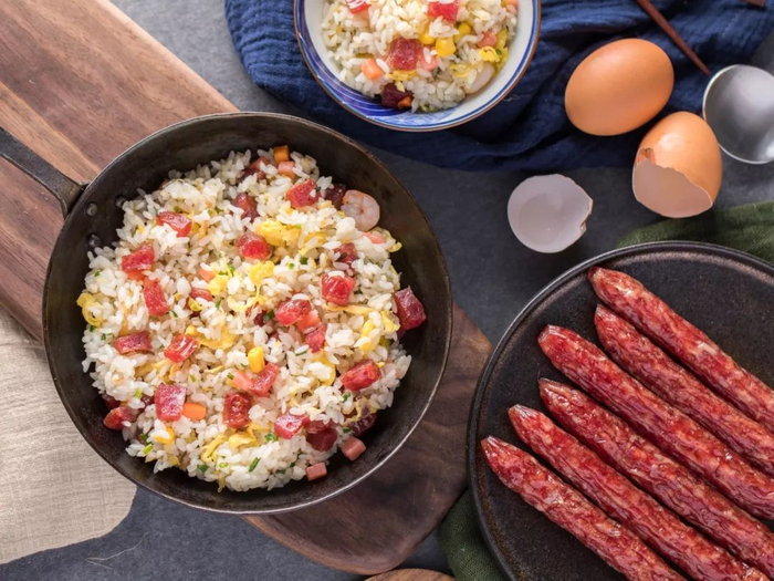 喜欢吃炒饭的朋友,可以试试把炒饭中的火腿肠、午餐肉用广式腊肠替代。