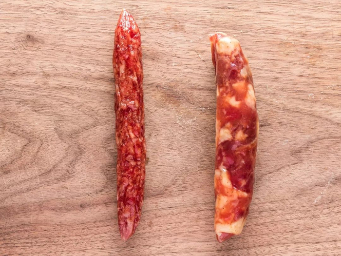 图中左侧是天然肠衣腊肠,右侧是人造肠衣腊肠
