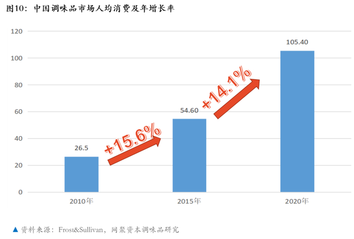我们研究调味品市场的货架,经过反复实地考察,发现日本货架上50%以上是复合型调味料;而在美国调味品市场,线上和线下,调味品区超过50%都是复合调味品。关于中国复合调味品的人均消费,我们把Frost&Sullivan的数据进行了再研究,就是分析和验证它的调研数据背后对应的事实和趋势。研究结果显示,从2010年到2015年这个阶段,在复合调味品消费上,中国的人均年增长15.6%。那么2015年到2020年这个期间,年增长14.1%,这样的一个成长基本上可以称之为五年增一倍。