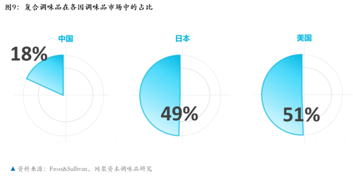复合调味品,在整个调味品大盘中的占比,市场调研公司Frost&Sullivan的数据显示,复合调味品在调味品市场中的占比,中国是18%,日本是49%,美国是51%。