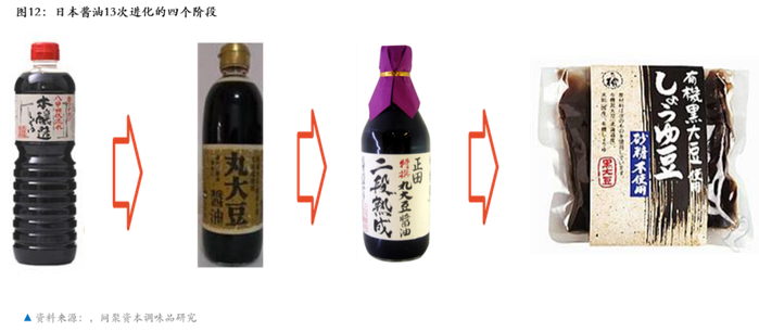 我们看看日本的酱油企业是如何进行进化的。经过研究,我们发现日本的酱油在发展过程之中,经历了13次进化,由初级压榨酱油经过13次进化变成了一种复合性的调味汁。