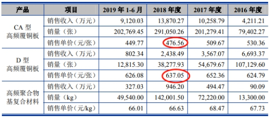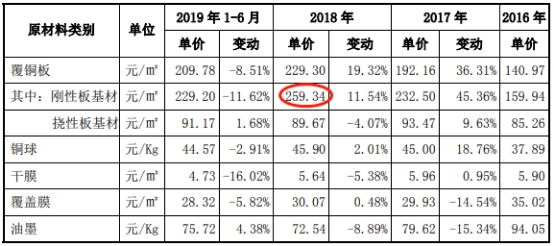 但与此同时,协和电子披露的覆铜板采购单价信息显示,刚性板基材类覆铜板采购单价在2018年仅为每平米259.34元;但据中英科技披露的刚性板基材类覆铜板销售单价,却在每平米476.56元至637.05元之间,远高于协和电子披露的采购单价。两家公司在产品购销金额基本一致的背景下,同类型产品的购销单价却存在很大差异。