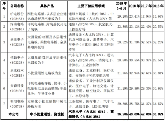 协和电子招股书表示,目前,PCB上市公司中不存在产品结构与公司类似的企业,毛利率不具有可比性。公司选取PCB上市公司的标准为:细分产品涉及汽车板、通讯板业务,以及从事中小批量板生产的上市公司。但从其披露的公开数据来看,无法获取其细分产品的全部数据。PCB上市公司之间在产品结构、生产规模、产品用途及客户结构等方面均不相同,导致PCB公司的毛利率水平存在差异。