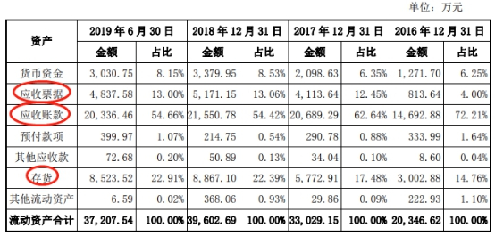 各期,应收票据、应收账款和存货3项合计占流动资产的比例分别为90.97%、92.57%、89.87%、90.57%。