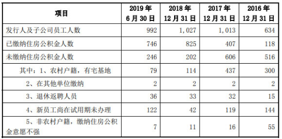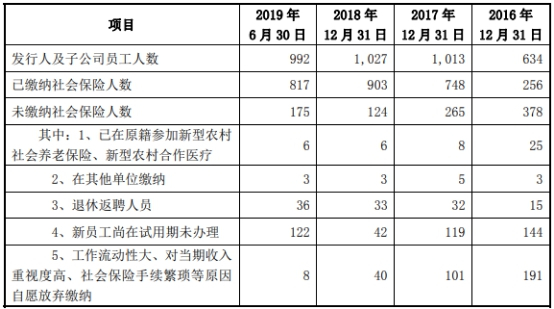 协和电子员工人数在2017年、2018年连增,但2019年上半年减少35人。此外,协和电子未缴纳社保及公积金的员工人数较多。