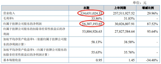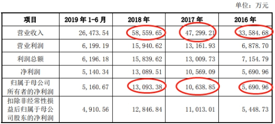 2019年版招股书显示,协和电子2016年-2018年营业收入分别为33,584.68万元、47,410.13万元、58,620.62万元,归属于母公司所有者的净利润分别为5,789.22万元、10,886.25万元、13,327.32万元。
