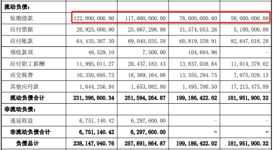 各期协和电子短期借款增长较快,在去年上半年已跃升至负债中的最大头。同期,协和电子短期借款分别为0.58亿元、0.78亿元、1.17亿元、1.22亿元。