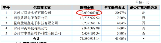 协和电子在新三板披露的2016年年报显示,常州市双进电子有限公司(以下简称“双进电子”)系协和电子2016年第一大供应商,采购金额为4003.01万元,年度采购占比达20.97%。