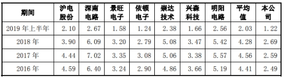 协和电子应收账款周转率始终低于同行。各期,协和电子应收账款周转率分别为2.49、2.59、2.69和1.22,同行业上市公司应收账款周转率平均值分别为4.41、4.56、4.28、2.03。